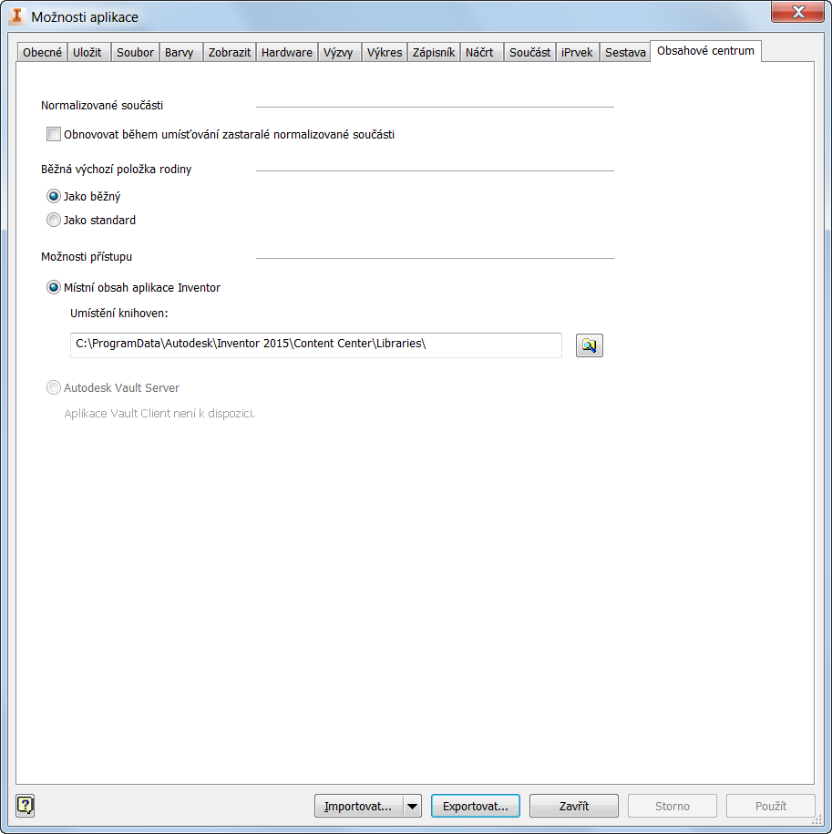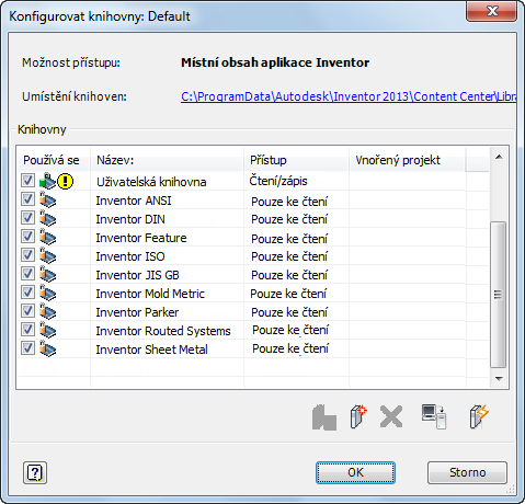 Místní obsah aplikace Inventor je ve výchozím nastavení umístěn ve složce C:\ProgramData\Autodesk\Inventor <verze>\Content Center\Libraries nebo C:\Documents and Settings\All Users\Application Data\Autodesk\Inventor <verze>\Content Center\Libraries. Toto výchozí umístění lze změnit na kartě Obsahové centrum v možnostech aplikace. Viz předchozí obrázek.