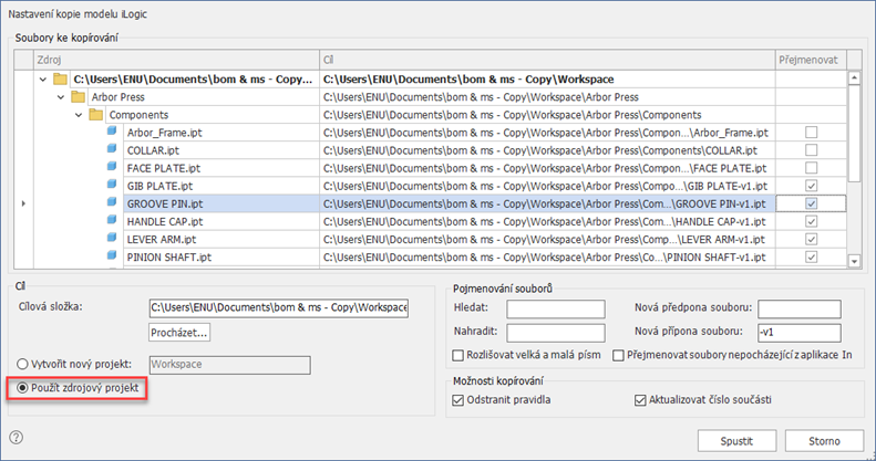 Nyní je možné znovu použít soubory bez jejich kopírování a vytvoření nového projektového souboru. Pokud je cílová složka stejná jako zdrojová složka, vyberte v dialogu nastavení nástroje Copy Design v modulu iLogic možnost „Použít zdrojový projekt“ a zadejte požadovanou předponu nebo příponu, případně přejmenujte soubory pomocí možností Vyhledat a Nahradit. Poté zrušte zaškrtnutí možnosti Přejmenovat u konkrétních souborů, které nechcete přejmenovat.