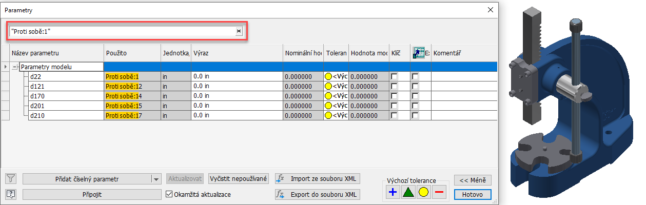 Nyní můžete rychle najít parametry pomocí nového vyhledávacího pole přidaného do horní části dialogu Parametry. Výsledky vyhledávání se automaticky aktualizují podle toho, jak budete určovat kritéria vyhledávání a zvýrazníte odpovídající vyhledávání. Vyhledávání se provádí ve všech polích parametrů a můžete například podle potřeby kombinovat různá kritéria vyhledávání nebo omezit vyhledávání, například v požadovaném sloupci.