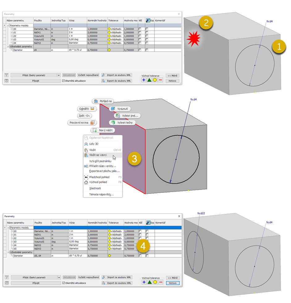 Při vkládání zkopírovaného náčrtu nyní místní nabídka obsahuje možnost Vložit se vzorci. Uživatelem definované parametry jsou zahrnuty v akci vložení. Parametry asociované se zdrojovým náčrtem jsou kopírovány a vkládány bez duplikování. Možnost Vložit se vzorci je podporována pouze v rámci stejného dokumentu, ne ve všech dokumentech.