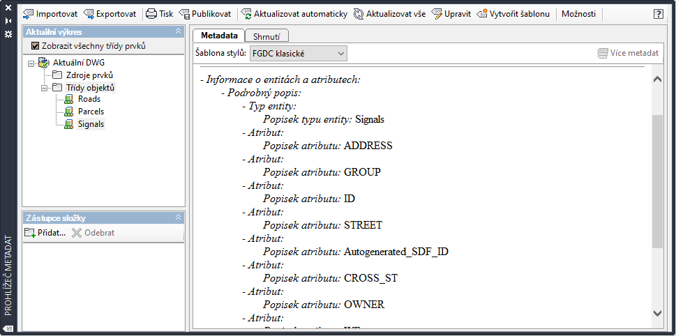 Pokud výkres obsahuje klasifikované objekty, při prvním otevření Prohlížeče metadat se automaticky vygenerují a zobrazí jeho metadata.