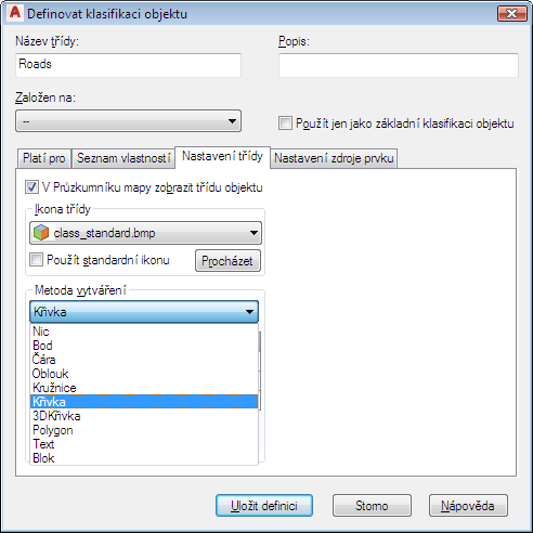 Chcete-li například změnit hladinu, typ čáry nebo barvu pro všechny členy třídy Cesty jako skupiny, vyberte tyto vlastnosti. Podle potřeby je možné nastavit výchozí hodnoty. Například všechny členy třídy Cesty můžete přiřadit k hladině Cesty.