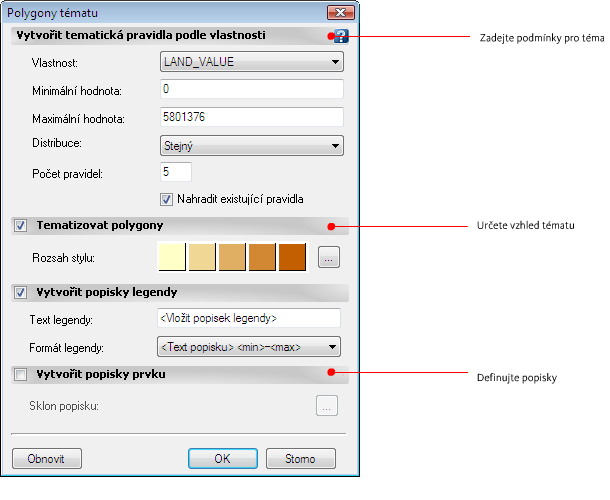 - V dialogu Téma hladiny pod položkou Vytvořit tematická pravidla podle vlastnosti klikněte na šipku dolů vedle položky Vlastnost a vyberte hodnotu HODNOTA_POZEMKU.