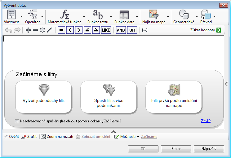 Záhlaví dialogu, ve kterém vytváříte výrazy, je rozdílné podle příkazu, který vyberete. Obsah dialogu bude stejný bez ohledu na vyvolávaný příkaz.
