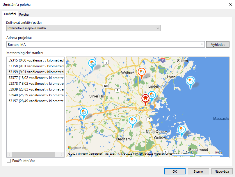 Před provedením energetické optimalizace modelu budovy určete její geografické umístění a vyberte nejbližší meteorologickou stanici.