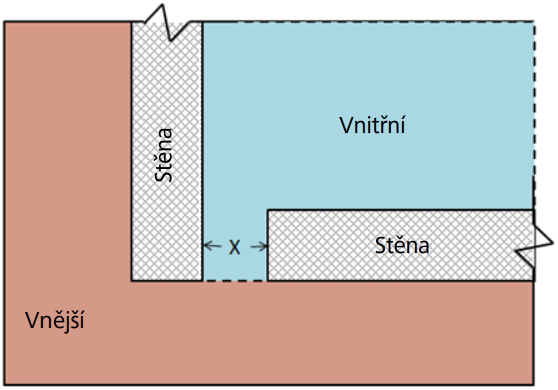 Tato koncepce je znázorněna na následujícím obrázku, kde v půdorysném pohledu jsou zobrazeny dvě stěny ohraničující vnitřní prostor, mezi kterými je mezera s kótou X.