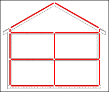 Pokud je režim energetické analýzy nastaven na možnost Použít stavební prvky nebo Koncepční objemy a Stavební prvky, všechny sousedící panely obvodového pláště stejného typu vytvoří jeden analytický povrch.