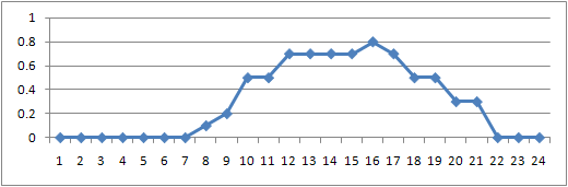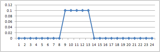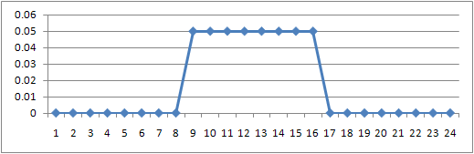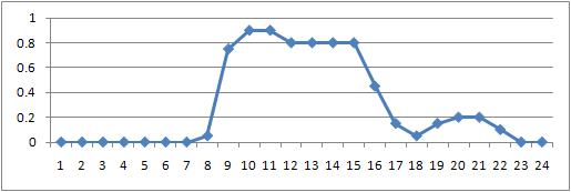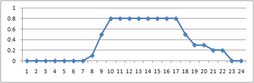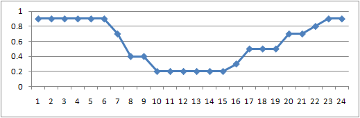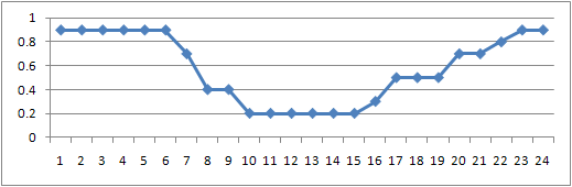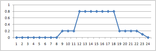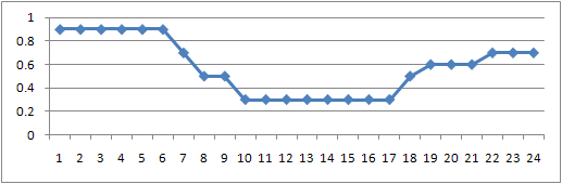 V následujících tabulkách jsou uvedeny pro každý výkaz obsazení hodinové hodnoty v rozsahu 24 hodin s počátkem o půlnoci (0 až 24 na ose x). Tyto hodnoty (0 až 1 na ose y) jsou zlomkové násobitele.