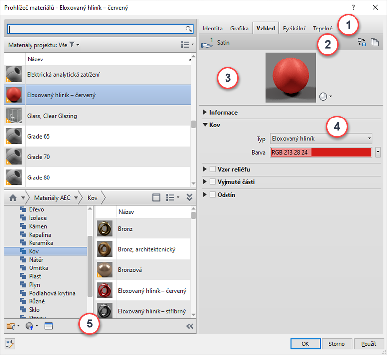 | 4 | Panel Vlastnosti: Slouží k zobrazení a správě detailních vlastností vybrané položky. Název a popis položky se zobrazí pod rozevíracím panelem informací. Výše uvedený příklad zobrazuje vlastnosti kovu zobrazené (rozbalené) pro položku vzhledu Eloxovaná – červená. Sadu vlastností, které se zobrazují například pro kapalinu, se liší od sad vlastností zobrazených pro plech. |