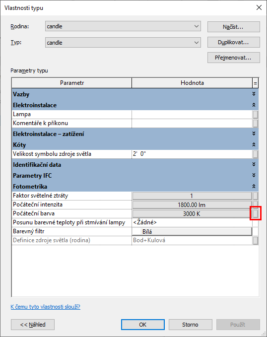 - V dialogu Kategorie a parametry rodiny vyberte v části Parametry rodiny možnost Zdroj světla.