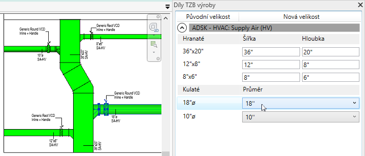 Při přesunutí ukazatele myši na velikost dílu na paletě Díly TZB výroby se odpovídající potrubí, izolace nebo systém potrubí zvýrazní na kreslicí ploše.
