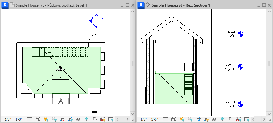 - Zavřete všechny pohledy kromě řezu a půdorysu podlaží, kam chcete umístit prostor, a zadáním příkazu w t pomocí klávesnice umístěte tyto dva pohledy do dlaždic.
