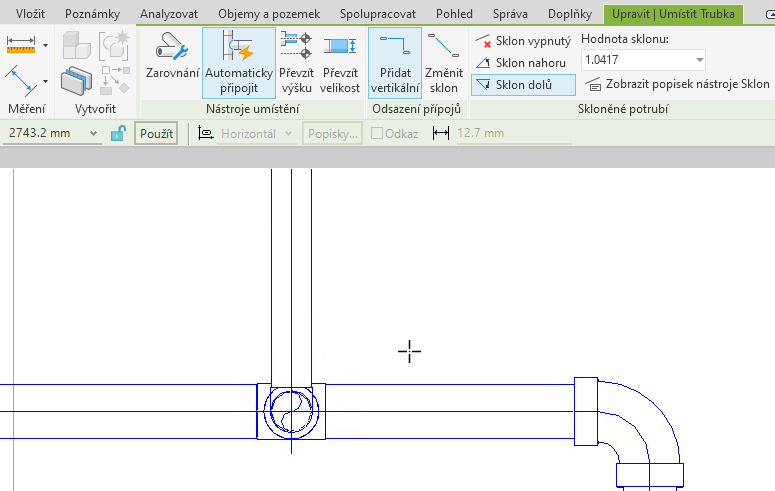- Chcete-li provést připojení přímo bez ohledu na hodnotu sklonu, na pásu karet klikněte na kartu Upravit | Umístit trubku