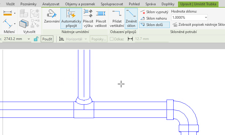 Úpravou ovládacích prvků výšky, které se zobrazí při výběru segmentu potrubí v pohledu, použijete malý sklon na trubku bez sklonu.