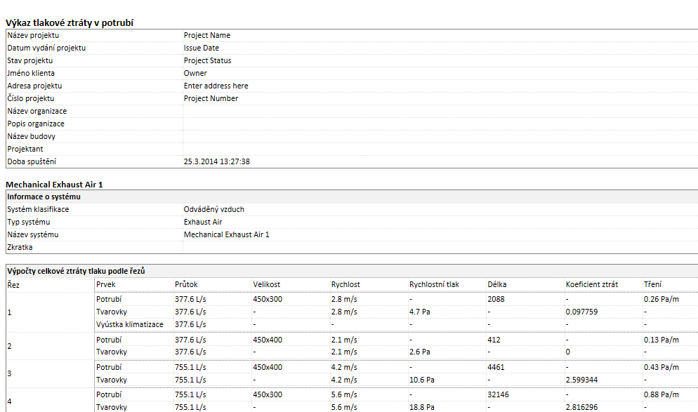 V projektu můžete vytvořit výkaz ztráty tlaku pro potrubí nebo trubky.