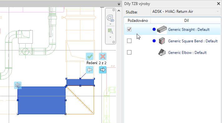 Na paletě Díly TZB výroby se zobrazí všechny díly použité v dostupných řešeních. Modrá tečka označuje, že je díl použit v aktuálně vybraném řešení. Jakmile umístíte kurzor na díl v seznamu, bude příslušný díl na kreslicí ploše zvýrazněn. Na paletě Díly TZB výroby zaškrtnutím políček filtrujte seznam dostupných tvarovek a snižte tak počet řešení.