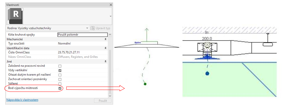 Úpravou rodiny pro osvětlovací těleso můžete povolit možnost Bod výpočtu místnosti a poté můžete přesunout umístění bodu výpočtu tak, aby byl umístěn uvnitř prostoru. V Editoru rodin povolte na paletě Vlastnosti možnost Bod výpočtu místnosti. Upravte umístění bodu výpočtu místnosti tak, aby byl umístěn uvnitř prostoru.