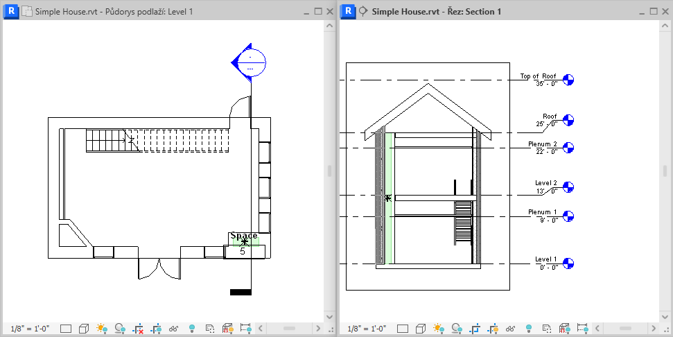 - Zavřete všechny pohledy kromě řezu a půdorysu podlaží, kam chcete umístit prostor, a zadáním příkazu w t pomocí klávesnice umístěte tyto dva pohledy do dlaždic.