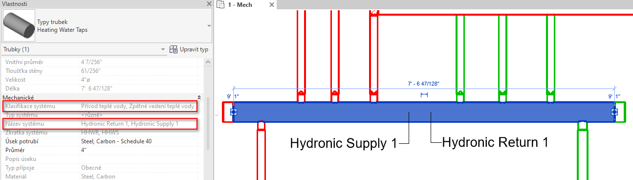 Pokud jsou sekundární smyčky spojeny s hlavní trasou pomocí vývodů, hlavní trasa bude obsahovat oba systémy primární smyčky – přívodní i zpětný. Tyto systémy bude rozděleny ve středu potrubí, jak je ukázáno na štítcích na obrázku níže. Všimněte si, že názvy i klasifikace obou systémů jsou zobrazeny na paletě Vlastnosti.