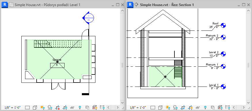 - Zavřete všechny pohledy kromě řezu a půdorysného pohledu podlaží, kam chcete umístit prostor, a zadáním příkazu w t pomocí klávesnice umístěte tyto dva pohledy do dlaždic.