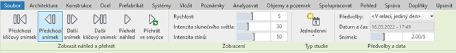 Předvolby a data: Ovládací prvky závisí na typu studie, pro kterou zobrazujete náhled. U typu studie Statický obrázek můžete vybrat aktuální předvolbu a nastavit aktuální datum a čas studie. U typů studií Jednotlivý den a Ve více dnech můžete vybrat aktuální předvolbu, zobrazit datum a čas aktuálního snímku a nastavit aktuální snímek studie. U typu studie Osvětlení můžete vybrat aktuální předvolbu a nastavit azimut a úhlovou výšku studie.