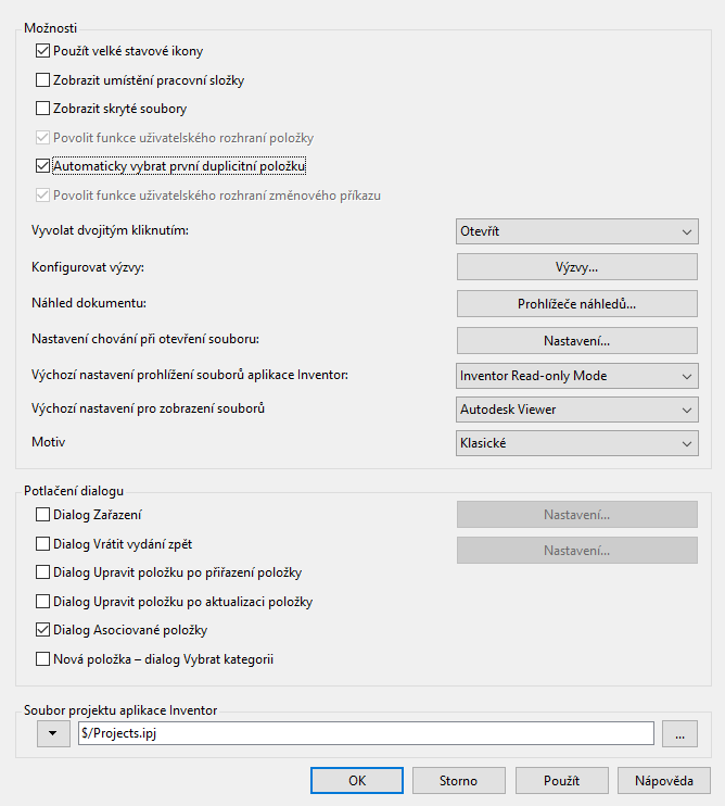 - Výchozí nastavení prohlížení souborů aplikace Inventor
