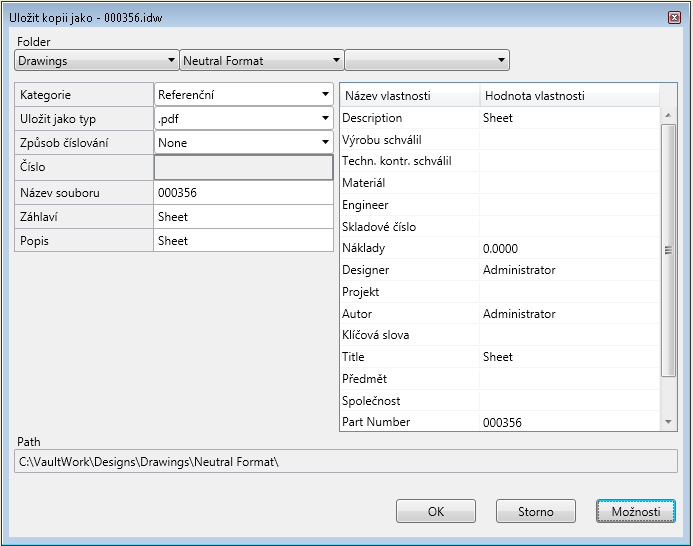Pomocí příkazu Uložit kopii jako lze kopírovat součásti, sestavy, výkresy a prezentace do jiných formátů, například DWG, STP, PDF nebo DXF.