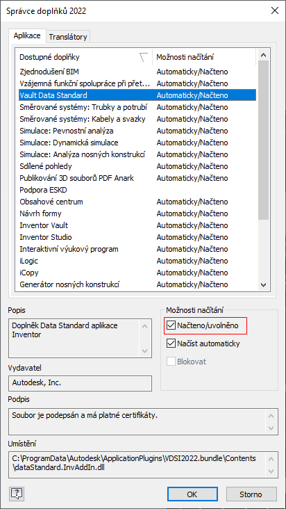 Povolení nástroje Data Standard pro aplikaci Inventor