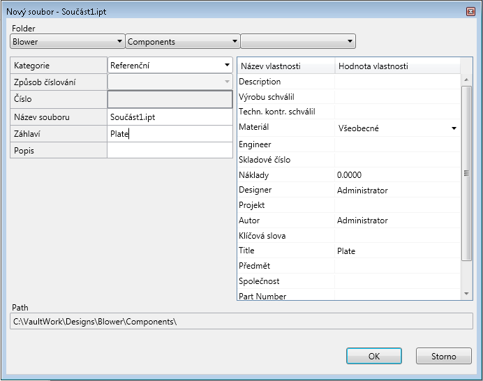 Dialog Data Standard aplikace Vault je dostupný v aplikaci Inventor a AutoCAD. Dialog Data Standard se zobrazí při prvním uložení souboru. Vyplňte požadovaná pole a všechna další pole nastavená správcem a kliknutím na tlačítko OK uložte data. Data jsou uložena jako datový list, který lze v budoucnu upravit.