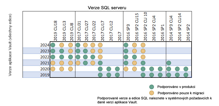 Následující tabulka označuje zelenými body kompatibilní verze aplikace Vault a serveru SQL. Žluté body představují doporučený průběh upgradu. Kompatibilitu své verze aplikace Vault a serveru SQL můžete ověřit v systémových požadavcích aplikace Vault.