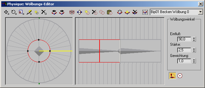 Der Winkel des Gelenks wird für den angezeigten Wölbungswinkel eingestellt. Wenn das Biped-Glied auf diesen Winkel gedreht wird, tritt der Netzwölbungseffekt mit voller Stärke auf.
