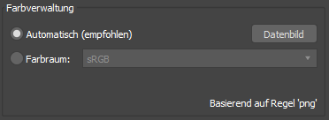 - Weist den durch die Regeln zur automatischen Farbraumzuweisung festgelegten Farbraum zu. Der zugewiesene Raum wird im Feld Farbraum schreibgeschützt angezeigt, und die entsprechende Regel wird unten angezeigt. Die Regeln können in den Farbverwaltungseinstellungen angezeigt und bearbeitet werden.