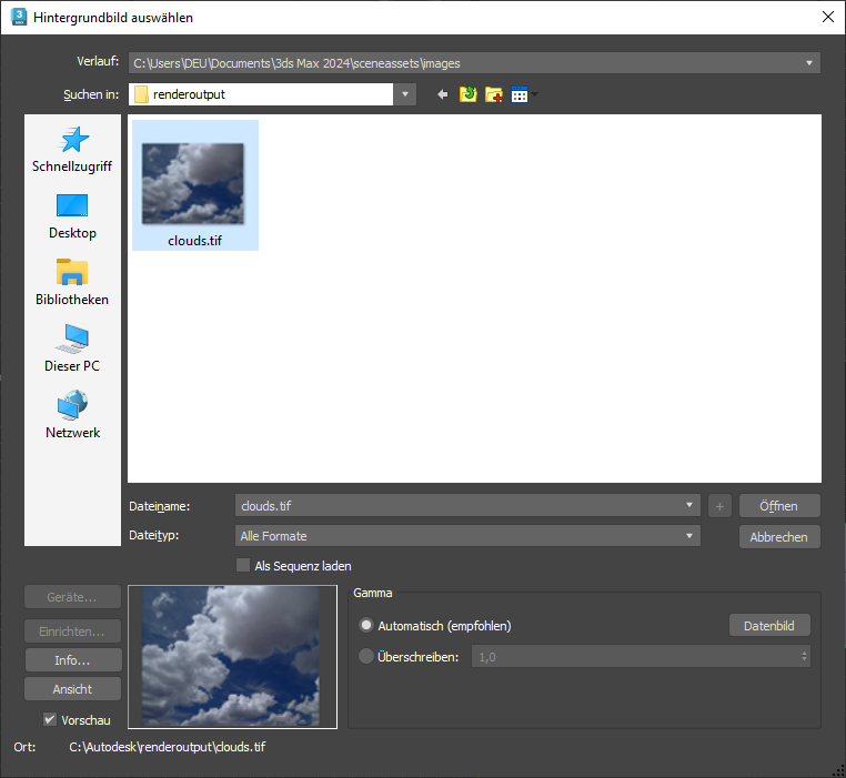 Anmerkung: Verwenden Sie "Überschreiben" nur, wenn Ihre Szene Bitmaps enthält, die von mehreren anderen Programmen erstellt (oder darin bearbeitet) wurden und das Gamma für jedes Programm unterschiedlich eingestellt werden muss.