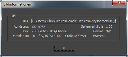- Zeigt weitere Informationen über die Datei an, so zum Beispiel die Frame-Rate, die Komprimierungsqualität, die Dateigröße und die Auflösung. Die hier angezeigten Informationen werden von den Informationen bestimmt, die zusammen mit dem Dateityp gespeichert werden.