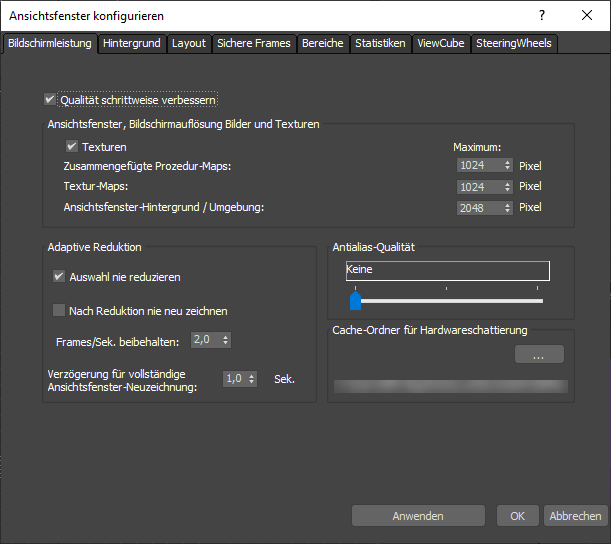 Das Dialogfeld Ansichtsfenster konfigurieren enthält Steuerungen für die Einstellung von Optionen zur Ansichtsfenstersteuerung.