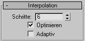 Ist das Kontrollkästchen markiert, wird die Zahl der Schritte für jeden Spline automatisch so eingestellt, dass eine glatte Kurve entsteht. Gerade Segmente besitzen immer 0 Schritte. Ist das Kontrollkästchen jedoch nicht markiert, wird die Interpolation mit den Optionen "Optimieren" und "Schritte" manuell bestimmt. Vorgabe = Deaktiviert.