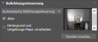 - Die Miniatur zeigt eine Vorschau der gerenderten Szene mit angewendeter Belichtungssteuerung an. Eine gerenderte Vorschau wird interaktiv aktualisiert, sobald Sie Einstellungen der Belichtungssteuerung ändern.
