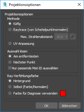 , um das Dialogfeld "Projektionsoptionen" (siehe Abschnitt unten) zu öffnen, in dem Sie die Projektionsmethode auswählen und die Optionen für Strahlentreffer und -verfehlungen anpassen können.