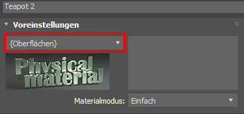 Die Teekanne ist nun farbig und weist ein nicht reflektierendes Äußeres auf. Sie können die anderen Einstellungen für die Optionen unter "Physikalisches Material" nach Belieben ändern, um mit anderen Aspekten wie Transparenz oder Metallartigkeit zu experimentieren.
