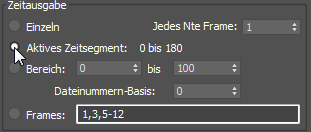 - Wählen Sie im Bereich "Zeitausgabe" die Option "Aktives Zeitsegment". (Wenn Sie für die Einstellung "Einzeln" belassen haben, wird nur der zurzeit angezeigte Frame gerendert.)