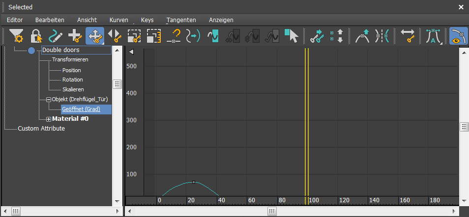 Das Fenster "Spuransicht – Kurveneditor" wird geöffnet, in dem der Parameter "Open" für das Objekt Doppeltüren markiert ist.