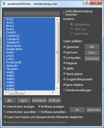 Die Drehtür wirkt ziemlich einsam, wie sie sich allein im Ansichtsfenster dreht. Sie können der Drehtür mithilfe des Befehls "Zusammenführen" einen stimmigen Kontext geben, indem Sie eine Szene zusammenführen, die einen Eingangsbereich zeigt.
