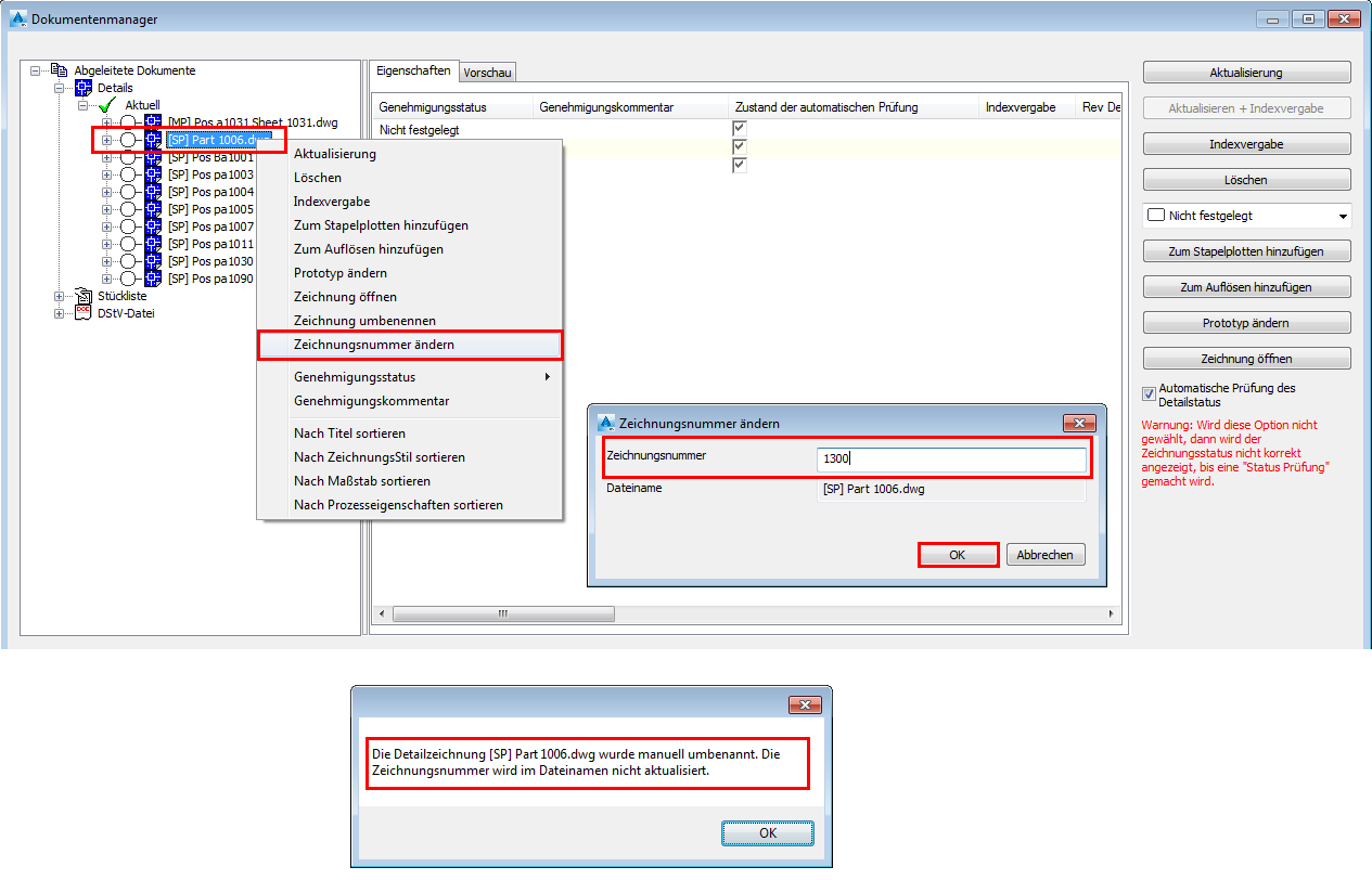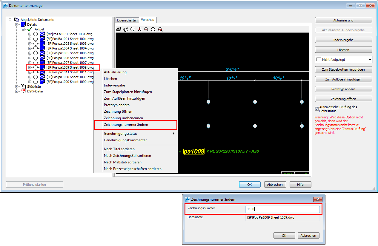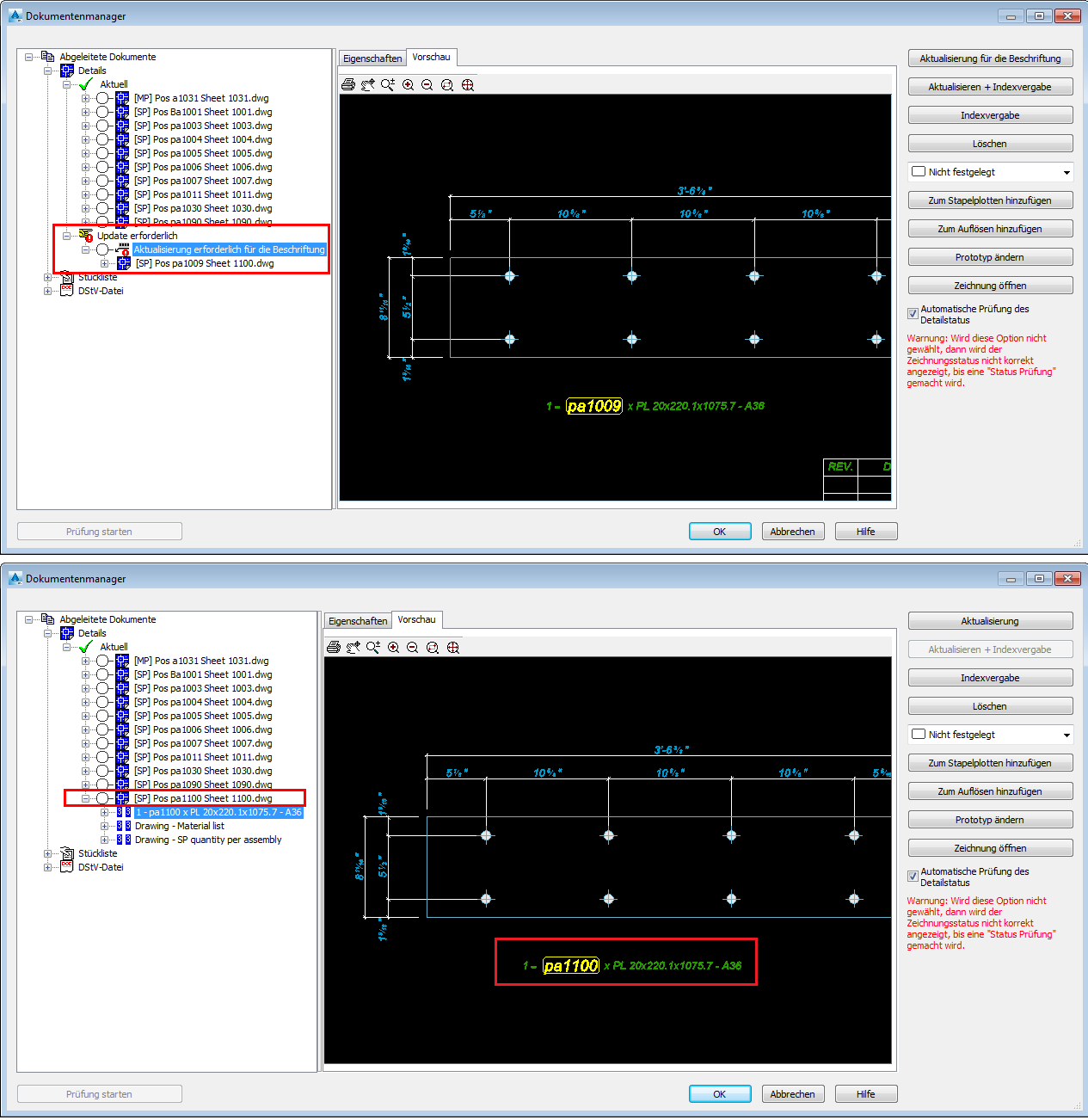 Sie können Zeichnungen direkt über den Dokumentenmanager aktualisieren. Darüber hinaus können Sie das Verhalten des Dokumentenmanagers für die Prüfung des Detailstatus steuern.
