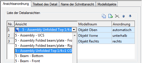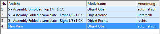 Für jede Ansicht können eine vordefinierte Modellbox und eine Anordnung ausgewählt werden. Ansichtseigenschaften werden angezeigt, indem Sie in der Tabelle auf eine Ansicht doppelklicken. Weitere Informationen finden Sie unter Ansichtseigenschaften.