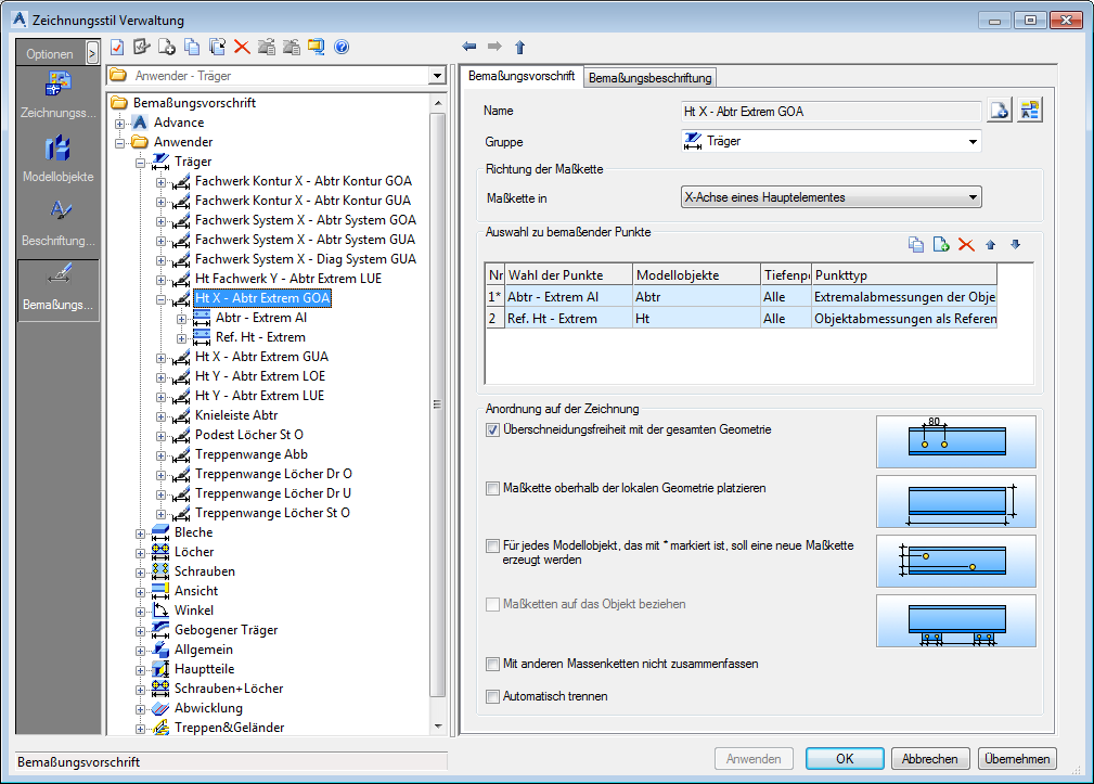 Legen Sie verschiedene Optionen für die Bemaßungsrichtung, die Auswahl von Maßpunkten oder die Position der Maßkette über die Eigenschaften der Maßdefinition fest.