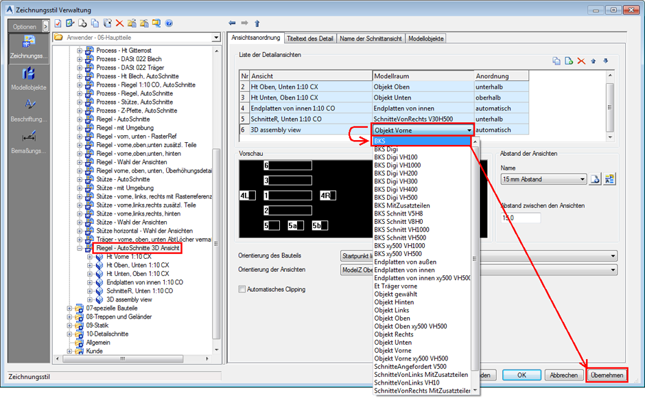 - Öffnen Sie die Zeichnungsstil-Verwaltung, wählen Sie den Zeichnungsstil, den Sie geändert haben, und klicken Sie auf Anwenden. Wählen Sie den Riegel, den Sie in der Detailansicht sehen möchten.