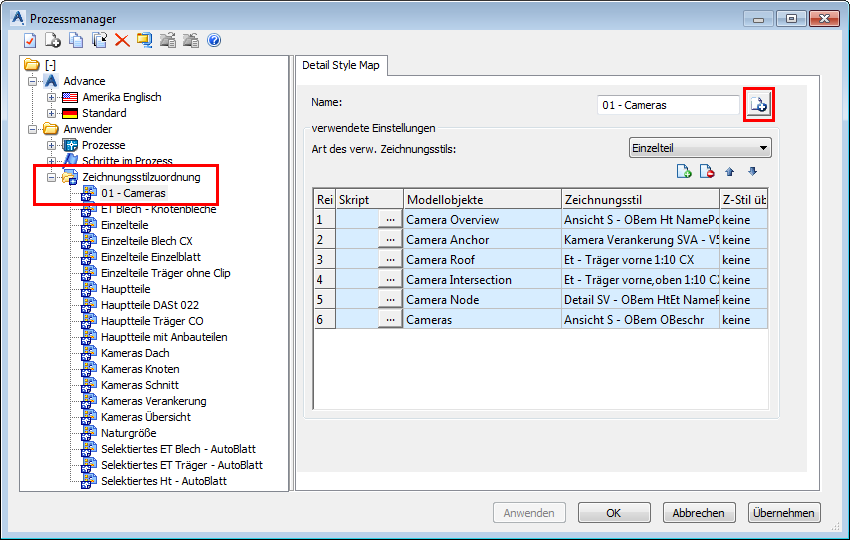 Die Zeichnungsstilzuordnung ist ein einfaches Werkzeug, mit dem eine regelgesteuerte Verbindung zwischen dem Modellobjekt und dem Zeichnungsstil hergestellt wird, mit dem Sie dieses spezifische Modellobjekt detaillieren möchten. Im Fall des Kameraprozesses wird diese Regel zwischen Modellobjekten, die die verschiedenen Kameratypen im Modell darstellen, und speziell zum Erstellen spezifischer Zeichnungen für jede Situation konfigurierten Zeichnungsstilen erstellt. Beispiel: Im folgenden Bild ist der Kameratyp für Anker dem Zeichnungsstil für Ankerpläne, der Kameratyp für Dächer hingegen dem Zeichnungsstil für Draufsichten zugewiesen. Diese Konfiguration macht aus dem Prozess ein universelles Detaillierungswerkzeug, mit dem Details für das ganze Modell erstellt werden - mit nur einem Klick.