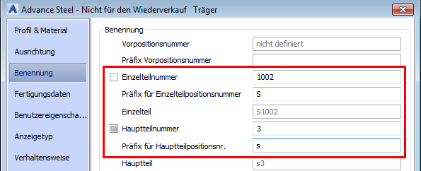Die Einzelteil- und Hauptteilnummern werden zusammen mit ihren Präfixen auf der Registerkarte Benennung des Eigenschaftendialogfelds für das Element angezeigt.