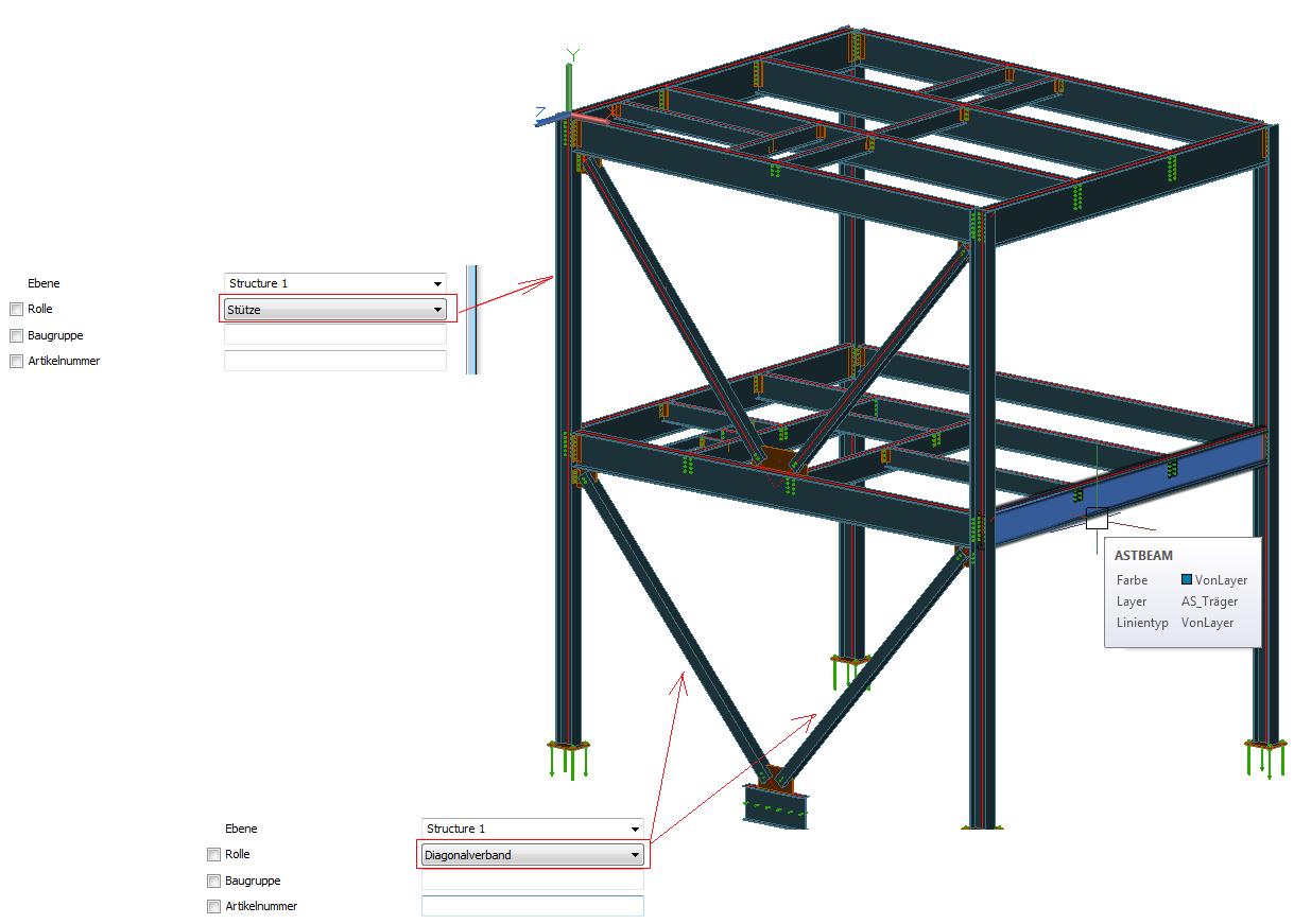 Da gleiche Objekte (Stahlträger und Bleche) unterschiedliche Präfixe haben, ist eine zusätzliche Filterebene für Objekte erforderlich, um Advance Steel die Unterscheidung zwischen einer Stahlträgerstütze und einem Stahlträgerwinkel (als Winkelanschlüsse genutzt) zu ermöglichen. Nutzen Sie die Modellrolle, eine Objekteigenschaft, die die Rolle der einzelnen Objekte im Modell unabhängig von ihren geometrischen Eigenschaften beschreibt:
