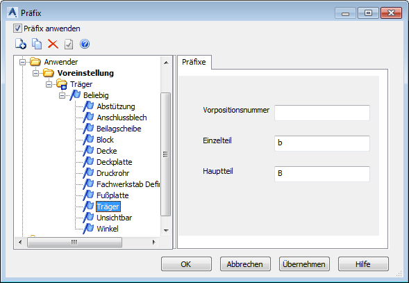 Zur Nutzung einer Präfixkonfigurationsregel bei der Positionierung markieren Sie das Kästchen Präfix anwenden oben links im Dialogfeld Präfix.